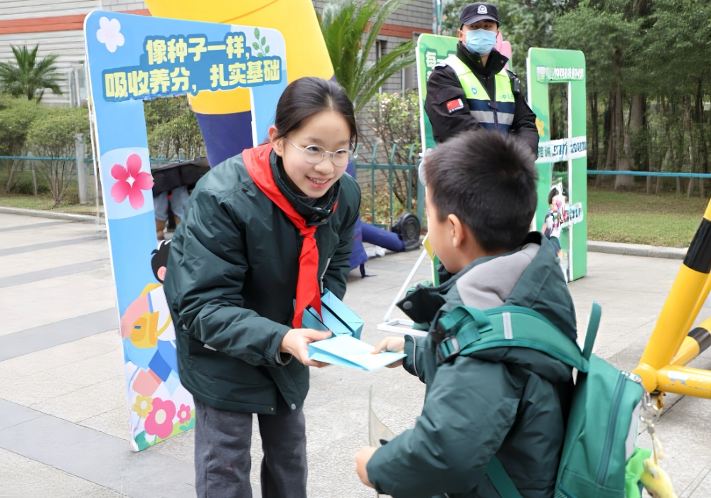 3月4日,南京市金陵河西学校小学部门前,由六年级的哥哥姐姐们化身的“春日小使者”,为返校的每一位学弟学妹送上精心准备的“春天种子礼包”。礼包里藏着春日的惊喜:一袋植物种子、一张待书写的种子心愿卡——新学期,每个孩子都像小种子一样,向阳生长。
