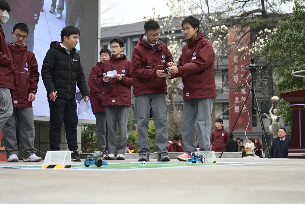科技互动环节,“马跃山河,智闯关山”智慧机器人挑战赛震撼登场。各年级战队操控机器人激烈对抗,现场欢呼声此起彼伏。比赛后还通过AI助手“豆包”揭晓了校园2025年度十大新闻:首夺耐高东区冠军,队员收获清华通知书;九中·德基艺术馆揭牌,成为长江路文化新名片;百万奖学金点亮成长之路;全市美育联动启新程,九中民乐成果引瞩目……“这些荣耀瞬间记录着九中人的奋斗足迹,激励全体师生在新学期继续策马扬鞭。”陈晓健如是说。