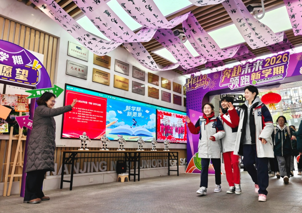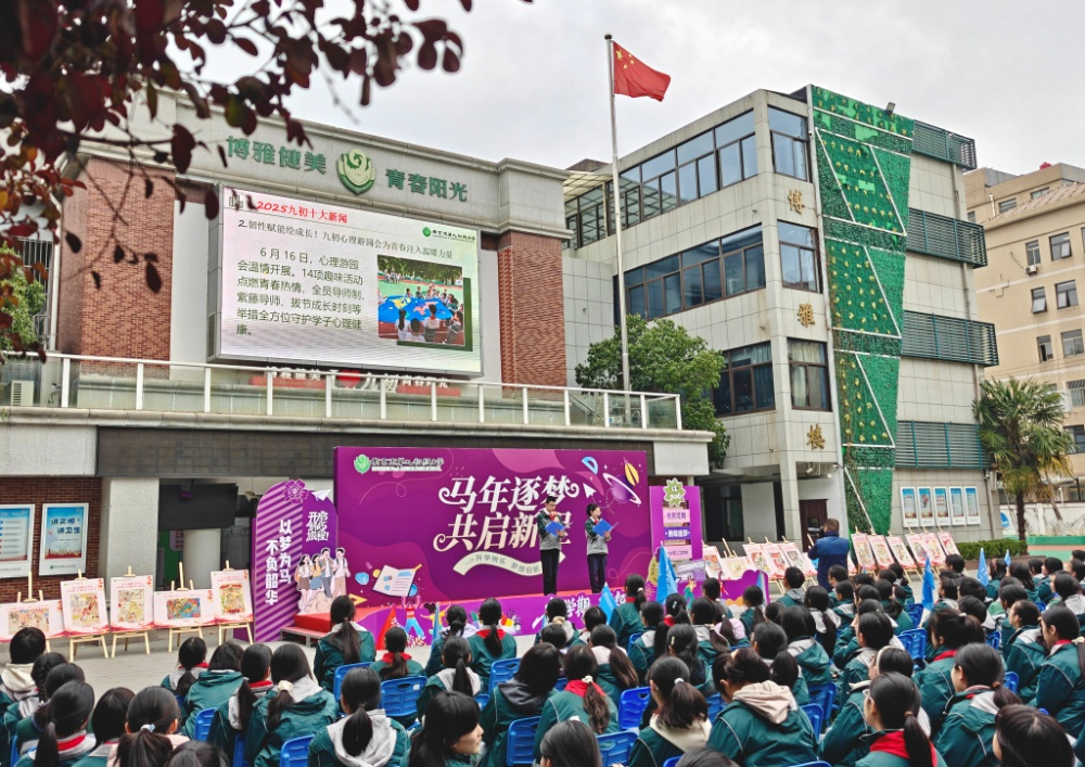 春风送暖,马蹄踏歌。3月4日下午,南京市第九初级中学“马年逐梦,共启新程”春季开学典礼在杨将军巷校区和长江路校区同步联动。为了给同学们制造更多开学期待与惊喜,学校提前“焕新”校园: 校园门厅处,机器人站姿整齐,唱着欢快的歌曲,迎接学生走进校园;同学们亲手制作的新年贺卡和新学期心愿卡悬挂在门厅两侧,一笔一画承载着对新年的美好期许与对未来的无限憧憬;篮球场上,“马年画廊”惊艳亮相,各班学生以马年为主题创作的绘画作品在这里集中展出,或灵动飘逸,或气势磅礴,尽显九初学子的艺术才情。