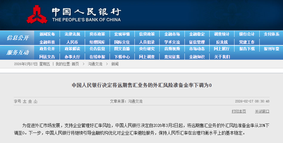 为促进外汇市场发展,支持企业管理好汇率风险,中国人民银行2月27日宣布,自2026年3月2日起,将远期售汇业务的外汇风险准备金率从20%下调至0。
