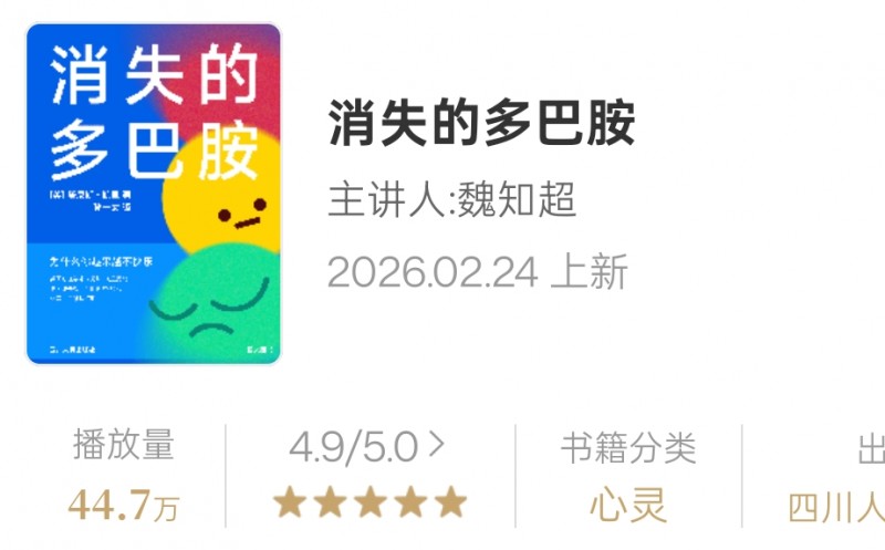 明明没有什么糟心事,但就是开心不起来?曾经热爱的美食、游戏,如今索然无味。这不是你一个人的困境,而是一场正在蔓延的“快乐危机”。多巴胺,这种曾被奉为“快乐信差”的神经递质,正在我们的生活中悄然“消失”。但它并非真的蒸发,而是被现代生活过度消耗与劫持。打开帆书APP非凡精读馆,魏知超将带你穿透表象,理解“快感缺失”的根源。这不是一本让人更焦虑的诊断书,而是一份关于如何重新校准快乐阈值、在平淡日常中打捞细微幸福的路线图。