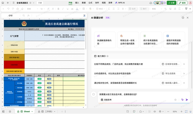 据了解,金山办公在AI侧一直创新不断,业界观察人士认为,WPS推出的AI功能正在被用户广泛认可及使用,标志着办公软件从基础办公场景向AI全场景办公升级。如此次实时路况表,一张小小的WPS云文档,在冰天雪地中架起了政府与群众之间的连心桥,也让人们看到了数字化工具赋能民生服务的无限可能。