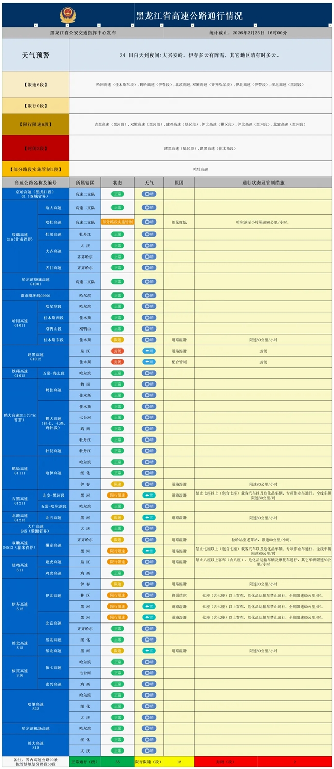 极端天气下,路况信息的实时性直接关系群众出行安全,因此官方的准确信息更需要与时间赛跑。黑龙江省公安厅高速公路交通管理局摒弃了复杂的技术开发流程,选择上手快、易操作、可实时共享的WPS云文档作为信息发布载体。交警工作人员在文档中清晰标注全省各高速路段的所属辖区、通行状态、天气情况、管制原因及具体通行要求,创新采用颜色标注机制将封闭路段自动标红、缓慢通行路段标黄,让群众一眼便能获取关键信息。