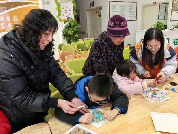 随后,孩子们围坐在桌前,小心翼翼地将一粒粒粮食粘贴在元宵主题的底稿上,圆滚滚的汤圆、红彤彤的灯笼、可爱的玉兔……一幅幅充满童趣的五谷画逐渐成型。志愿者和家长们在一旁耐心协助,现场洋溢着欢乐的氛围。