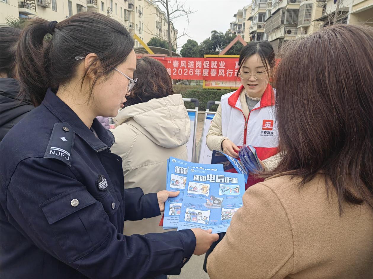 3月4日上午,高淳区固城街道2026年新春招聘会现场人气十足。借此良机,街道平安办联合固城派出所,在前锦苑小区同步开展了一场重点突出的防范电信网络诈骗宣传活动,将就业服务与平安建设紧密结合,为求职者送上“安全”与“岗位”双重大礼。