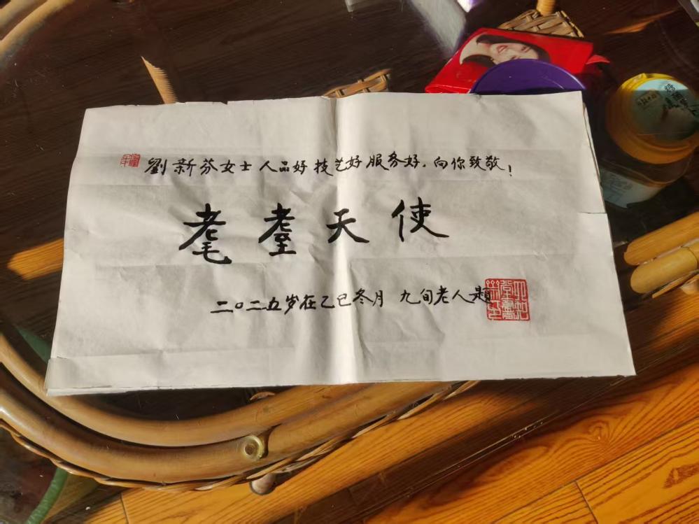 年过九旬的杨爷爷,是一名退休人民教师,自享受居家上门服务以来,这些年更换过多名养老护理员,遇到我司护理员刘新芬后,便指定让刘新芬服务,也许是眼缘,但更多的是信任。每次上门服务之前,刘新芬都会提前电话预约,杨爷爷平时在家喜欢练习书法,刘新芬每次都会在一旁静静地等待,从不打扰。虽然每个月的服务内容都是一样,理发、泡脚、修剪手指甲,修剪脚趾甲等,她都是认真细致地服务,2小时的服务时长远远不够,她总是笑着保证服务质量。杨爷爷送来表扬信,称她为“耄耋天使”。