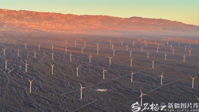 1月12日,在哈密市伊州区东部拍摄的哈密烟墩风电基地一角。石榴云/新疆日报记者 蔡增乐摄