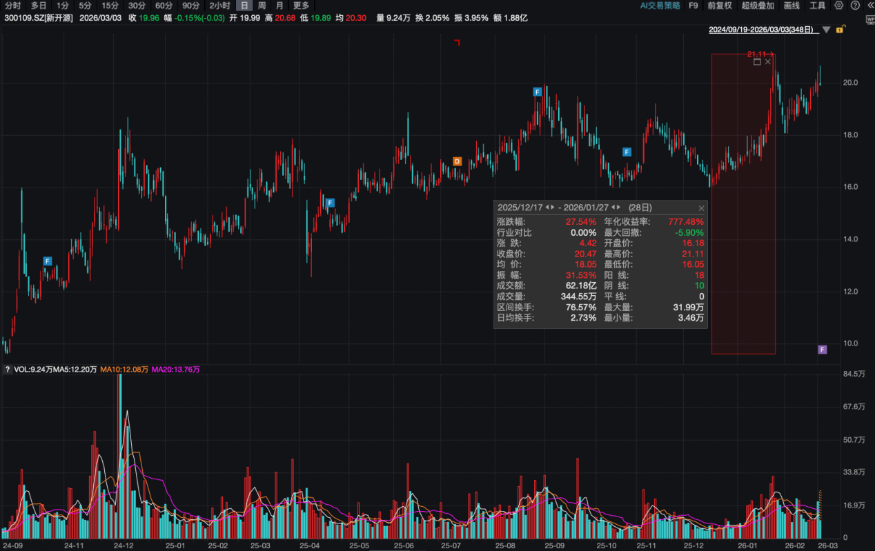 二级市场方面,公司股价于2025年12月17日迎来一波28个交易日推升市值冲涨近28%的行情,目前股价依旧维持连续上涨态势。