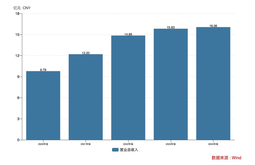 公告资料显示,公司营收总量由2020年的9.79亿元连续增至2024年的16.06亿元,年均复合增速13.17%。