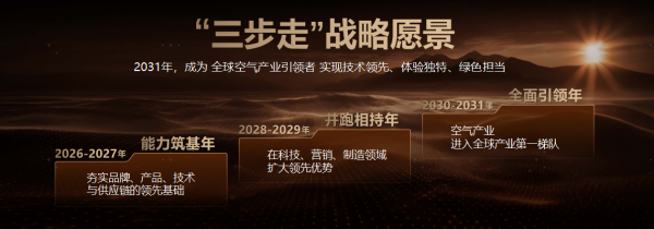殷必彤在演讲中提到,海信空气产业已确立了“三步走”战略愿景:锚定2031年成为全球空气产业引领者的目标,分三个阶段完成产业的全球化进阶。按照战略规划:2026-2027年,产业将聚焦能力筑基,夯实品牌、产品、技术与供应链的领先基础;2028-2029年加速并跑相持,扩大科技、营销、制造领域优势;2030-2031年实现全面引领,推动海信空气产业迈入全球第一梯队,以技术领先、体验独特、绿色担当重塑行业格局。
