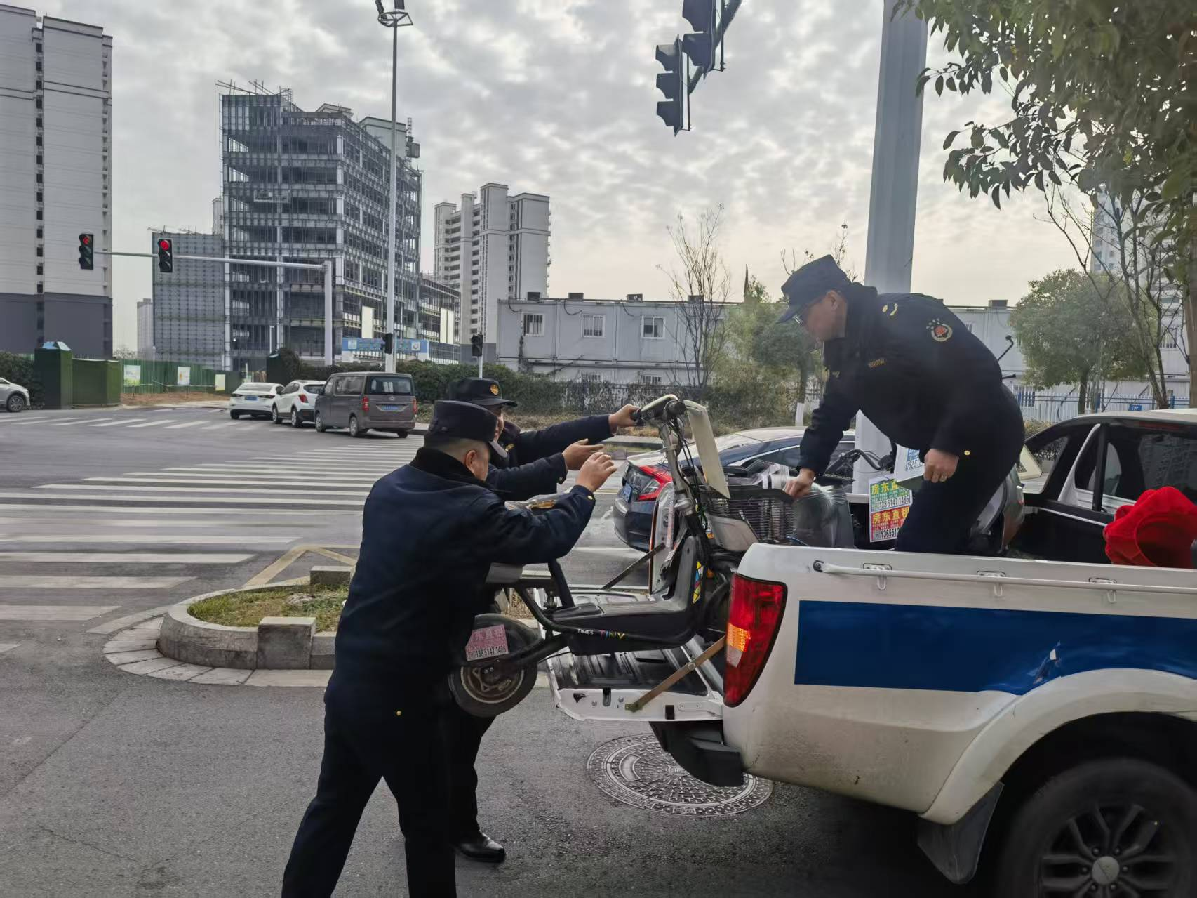 行动现场,执法队员分为两组展开工作:一组对辖区主次干道、商超周边、社区路口等区域的“僵尸车”进行拉网式排查,仔细确认车辆状态、核对车辆信息;另一组则负责现场清理,对无人认领的废弃三轮车、电动车等,通过人工搬运和车辆拖运相结合的方式,统一移至指定场所。
