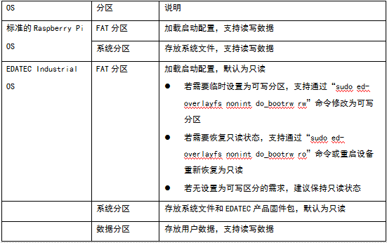 • 系统分区:存放操作系统核心文件及EDATEC产品固件包,默认为只读状态