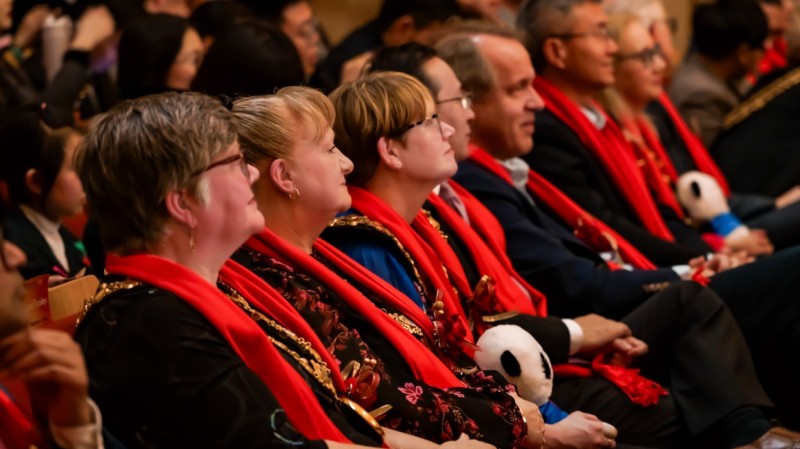 当晚,中华人民共和国驻曼彻斯特总领事馆总领事唐锐、副总领事秦向东,特拉福德市市长John Brophy,斯托克波特市市长Kerry Waters,罗奇代尔市市长Janet Emsley,塔姆塞德市市长Shirley Alam,孟加拉人民共和国驻曼彻斯特助理高级专员Mohammad Jobayed Hosen,西班牙驻曼彻斯特总领事馆特别代表Marc Barrio Gázquez,曼彻斯特大学校长Duncan Ivison、国际关系处主管Tanya Luff,曼彻斯特城市大学国际事务总监Matt Dean等中外政要、学术代表及社会各界人士应邀出席,与现场观众共赏文化盛宴,同贺新春佳节。