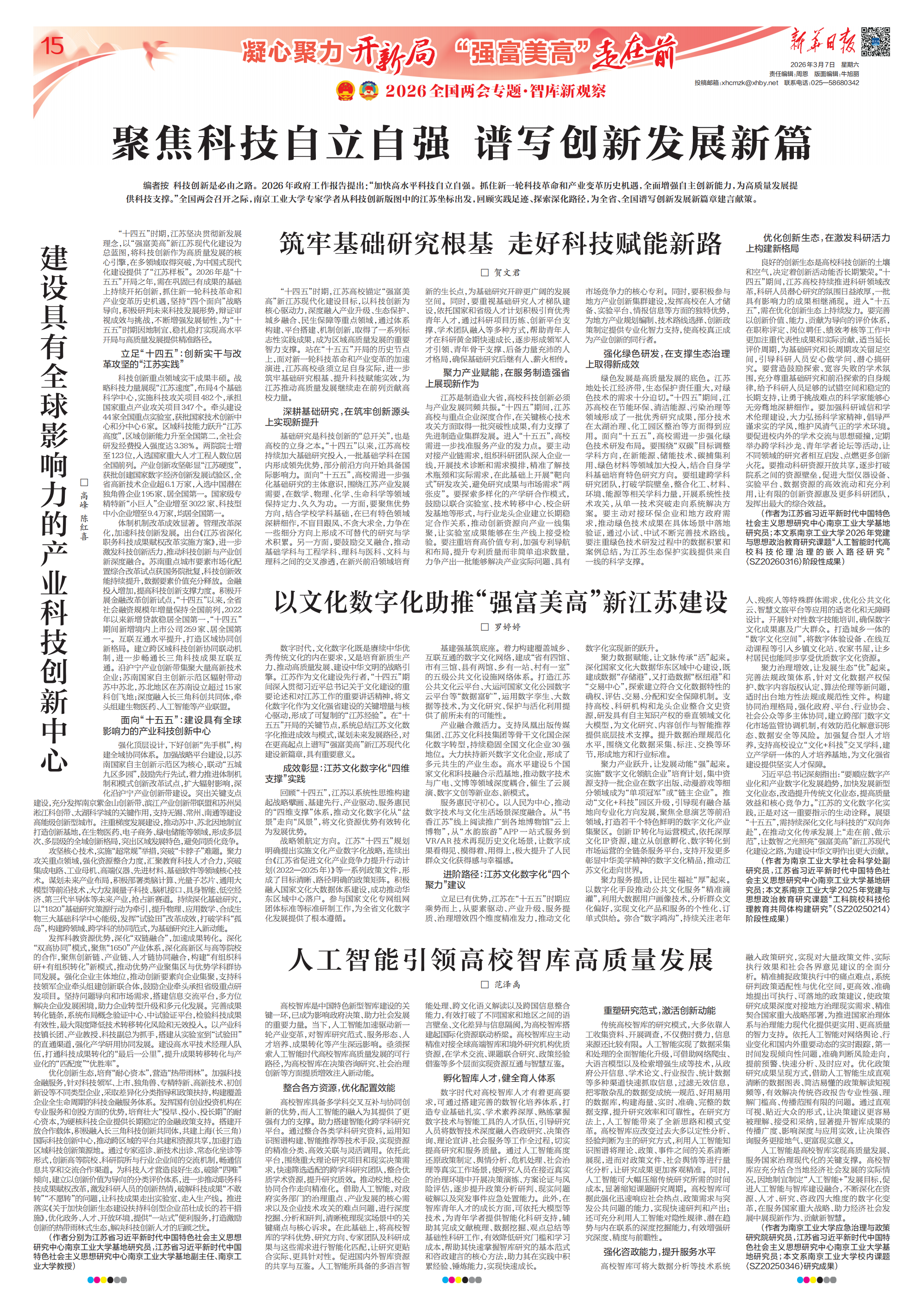 “十四五”时期,江苏坚决贯彻新发展理念,以“强富美高”新江苏现代化建设为总蓝图,将科技创新作为高质量发展的核心引擎,在多领域取得突破,为中国式现代化建设提供了“江苏样板”。2026年是“十五五”开局之年,需在巩固已有成果的基础上持续开拓创新,抓住新一轮科技革命和产业变革历史机遇,坚持“四个面向”战略导向,积极研判未来科技发展形势,辩证审视成效与挑战,不断增强发展韧性,为“十五五”时期因地制宜、稳扎稳打实现高水平开局与高质量发展提供精准路径。