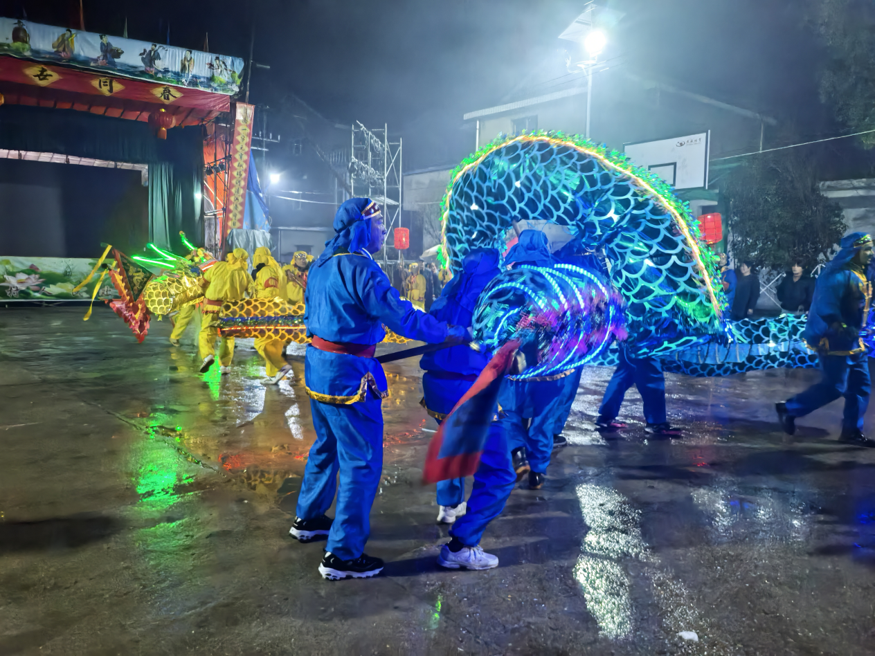 舞龙表演过后,戏曲展演轮番开唱。经典选段韵味悠长,演员唱腔婉转悠扬,在村落间久久回荡。台上演员倾情演绎,台下观众听得如痴如醉,当晚虽细雨绵绵,却浇不灭大家对传统文化的热忱,湿不透乡亲们凝心聚力的归属感,熄不了家家户户对新春佳节的美好期盼。