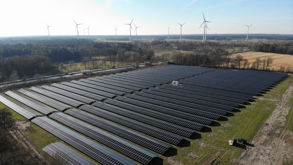 3月,德国中部的一座小镇,71.25MW光伏电站正在抓紧建设当中,即将全面投运。纯黑的ABC光伏组件阵列与墨绿的农田毗邻,拼接出科技与生态交相辉映的乡村景致,共同迎接明媚的阳光。