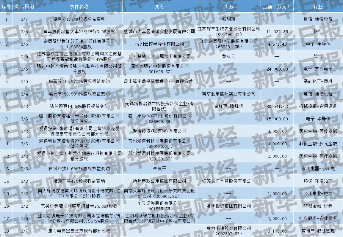 盐城市大丰区海城实业发展有限公司受让辉丰股份所持大丰农商银行3.9%股权,约1.1亿元。扬州市政公用集团有限公司受让洁源环境47%股权,水务资产划转至市政集团。无锡新投启航(国资背景)受让法兰泰克股权。