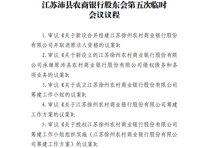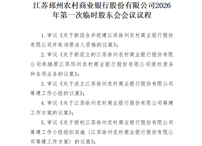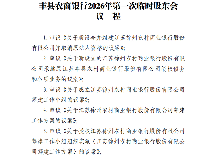 2月13日,徐州农商银行、新沂农商银行、邳州农商银行、睢宁农商银行、丰县农商银行、沛县农商银行同步发布通知,定于2月28日下午召开临时股东会。其中徐州、邳州、新沂、丰县、睢宁5家机构召开的是2026年第一次临时股东会,沛县农商银行召开的是股东会第五次临时会议,6家机构会议的核心议程均为审议《关于新设合并组建江苏徐州农村商业银行股份有限公司并取消原法人资格的议案》及相关事项。这意味着,一旦议案获各机构股东大会审议通过,这六家银行将启动合并程序,原有的法人资格将相应取消,整合为单一法人的徐州农商银行。