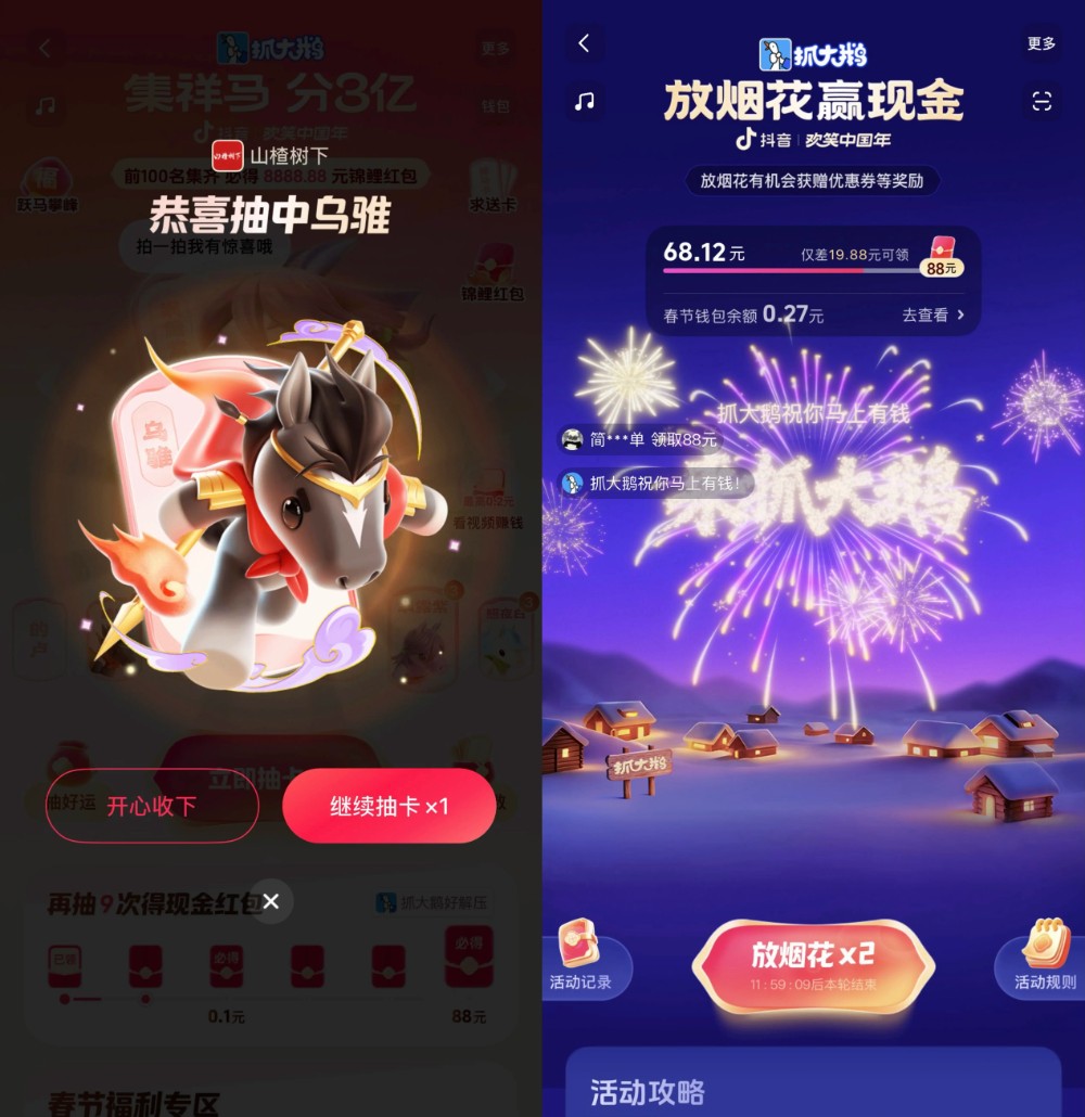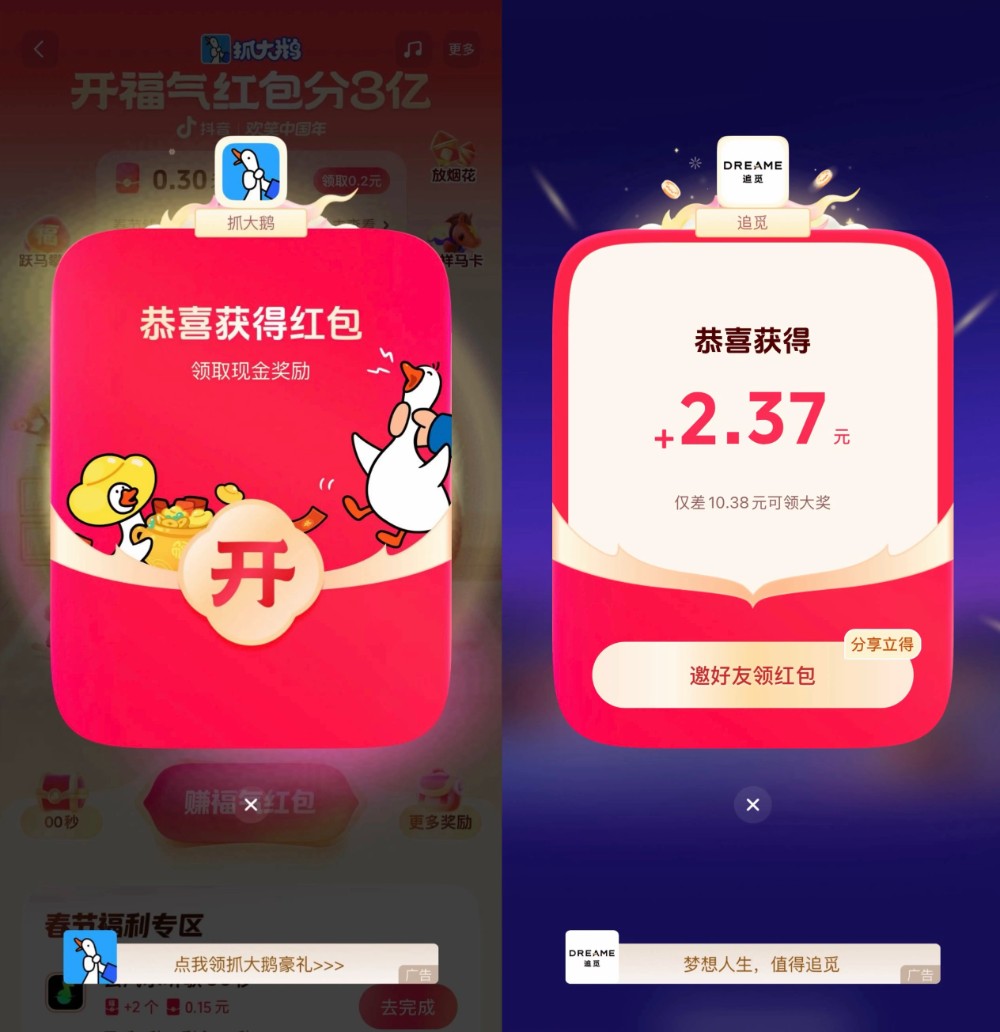 用户观看抓大鹅直播、或者在活动页面直接试玩抓大鹅小游戏,就能解锁奖励。这些设计大大提高了用户体验游戏的意愿,定制任务和专属游戏奖励也推动用户进入专属页面,高效解锁游戏试玩等用户行为,用户也能随时随地通过“抓大鹅”获得即时的放松与快乐。它不再仅仅是一个游戏,而变成了用户在这个春节里一个稳定的“情绪出口”。