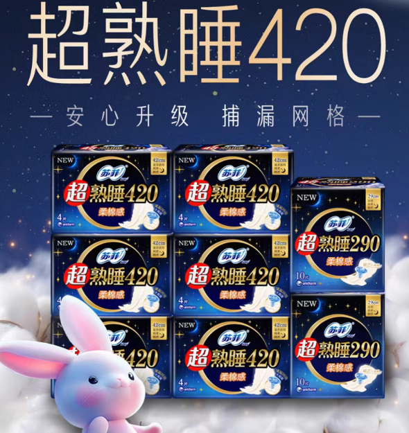 苏菲超熟睡系列专为夜间深度防护打造,采用420mm超长设计并加宽尾翼,全面覆盖臀部区域,有效防止后漏。产品配备三层立体防漏围,紧密贴合身体曲线,在翻身或睡姿变化时依然有效防止侧漏和后漏。芯体运用多层导流技术,使液体迅速下渗并均匀扩散,避免局部积聚,整晚维持表面干爽,是追求夜间无忧睡眠用户的理想选择。