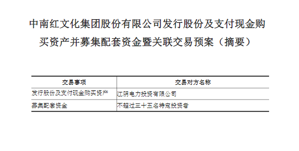新华日报财经讯 近日,沉寂多年的江阴中南红文化集团股份有限公司(以下简称“中南文化”,股票代码:002445.SZ)发布重大资产重组预案,拟通过发行股份及支付现金的方式,收购江阴电力投资有限公司(以下简称“电力投资”)持有的江阴苏龙热电有限公司(以下简称“苏龙热电”)57.30%的股权。