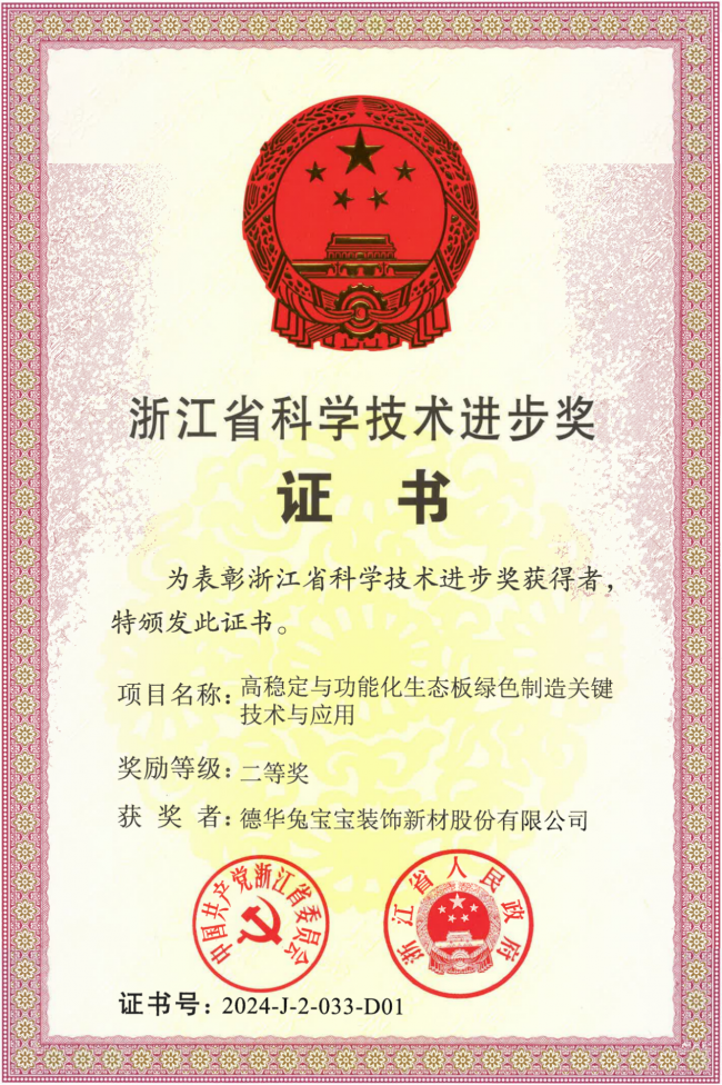 3月3日召开的湖州市2026年全市科技系统工作推进会暨全面从严治党工作部署会上,德华兔宝宝装饰新材股份有限公司主持的“高稳定与功能化生态板绿色制造关键技术与应用”项目,荣获2024年度浙江省科学技术奖科技进步二等奖。这已是公司第三次荣获浙江省科技进步奖,不仅彰显了兔宝宝在人造板领域持续的研发实力与行业技术引领地位,更是对其坚持科技创新、践行绿色发展战略的权威肯定。