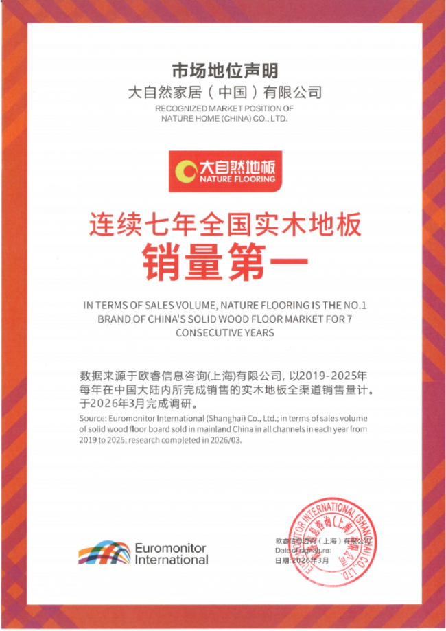 3月10日,大自然家居新零售委员2026首届盛会隆重举办,会上,国际权威调研机构欧睿信息咨询(上海)有限公司发布最新市场数据:大自然地板2019-2025连续七年全国实木地板销量第一。(数据来源于欧睿信息咨询(上海)有限公司,以2019-2025年每年在中国所完成销售的实木地板全渠道销售量计。于2026年2月完成调研)。