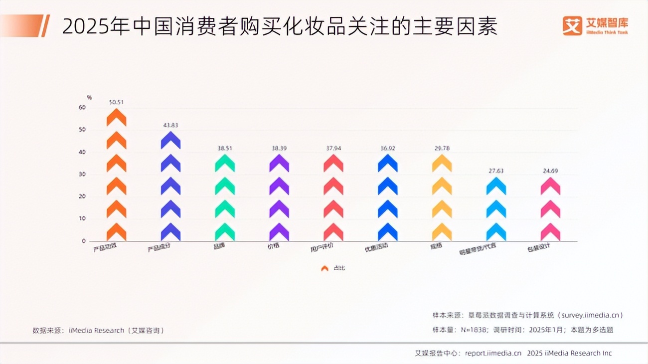 消费升级时代,消费者可选择的产品越来越多,对化学添加剂的警惕情绪显著升温。iiMedia Research(艾媒咨询)发布的《2025年中国化妆品行业市场发展状况与消费行为调查数据》显示,2025年中国消费者购买化妆品时,产品功效(50.51%)与产品成分(43.83%)已成为决策的前两大考量因素,“纯净美妆”(Clean Beauty)理念的市场接受度快速提升。