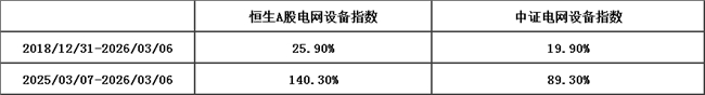 先看电网设备,选电网相关指数,核心要看“龙头集中度”。市场上有两条相关指数,恒生A股电网设备指数和中证电网设备指数,数据说话更有说服力:自2018年基日至今,恒生A股电网设备指数年化收益25.9%,远超中证的19.9%;近一年涨幅更是达到133.6%,高出中证50个百分点。