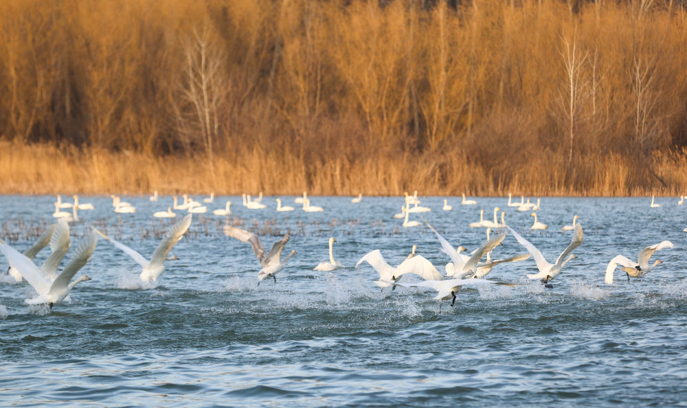 春风轻拂过黄河湿地,万物苏醒。在河南省三门峡市天鹅湖国家城市湿地公园,大天鹅舒展白羽,开启北迁之旅。