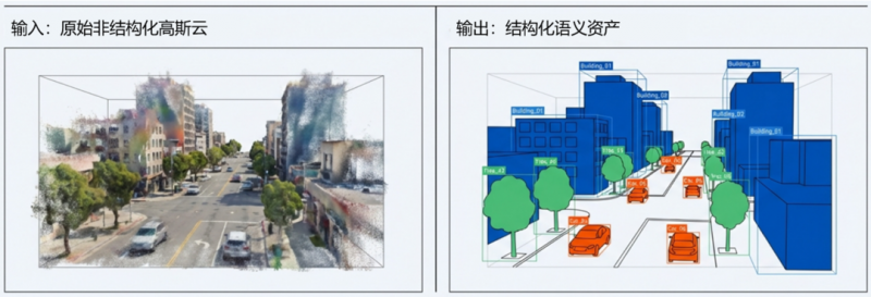 简单来说,我们可以将AI在2D图像上识别出的物体轮廓(比如一辆车),以像素级的精度反向投影到这些3D高斯球上。那么,被投影到的所有高斯球,就自动具备了“这是一辆车”的语义信息。通过多轮学习和训练,同一语义标签下的高斯球会自动聚类成一个独立的数字对象(比如“车辆-001”)。每个高斯球都新增了语义通道,包含了类别ID、实例ID等属性。随着新视频帧的持续输入,物体边界的描绘也会越来越精准。整个系统就这样自动地完成空间语义的提取、注入和优化。