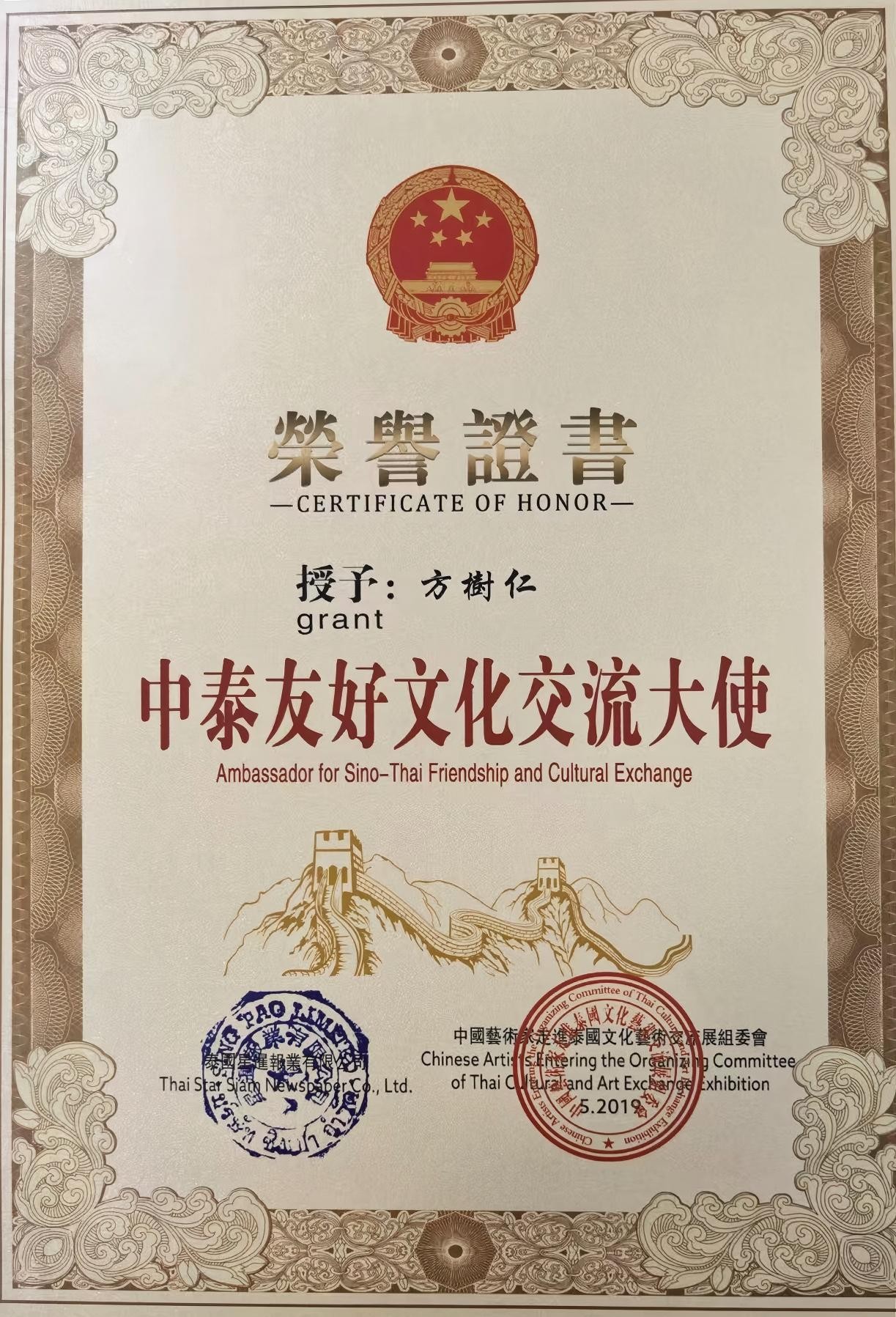 形式上,吸纳现代美学,简化细节、适度用彩,保留传统水墨韵味的同时提升当代质感,契合当代审美习惯;同时积极探索当代传播路径,2019 年随中国艺术家代表团出访泰国、马来西亚进行文化交流,创作的国画作品被泰国中国文化研究院、泰国《星暹日报》社等多家海外机构收藏,推动作品走向大众与国际,扩大东方山水美学的影响力,被授予 “中泰友好文化交流大使”“中国和马来西亚文化交流使者” 等荣誉称号。