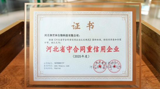 近日,河北省诚信协会及企业信用研究院联合揭晓2025年度河北省守合同重信用企业。河北御芝林生物科技有限公司荣获“河北省守合同重信用企业”证书,这是公司连续两年获此殊荣。