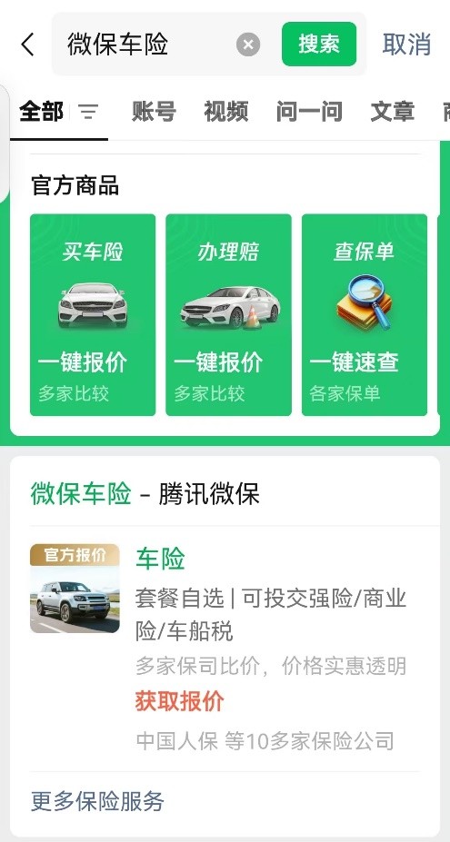 车险比价无论在线上还是线下都已成为市场刚需。在腾讯微保小程序,用户仅需输入车牌号等基础信息,系统便会推荐展示覆盖平安产险、人保财险、太平洋产险等十余家主流保险公司的报价和服务,车主可直观对比价格与保障方案,按需选择,平台一次性报价成功率超90%。用户在微保平台完成比价后,最终下单的转化率高达20%,远超传统线下单一推荐和被动电销的转化率。