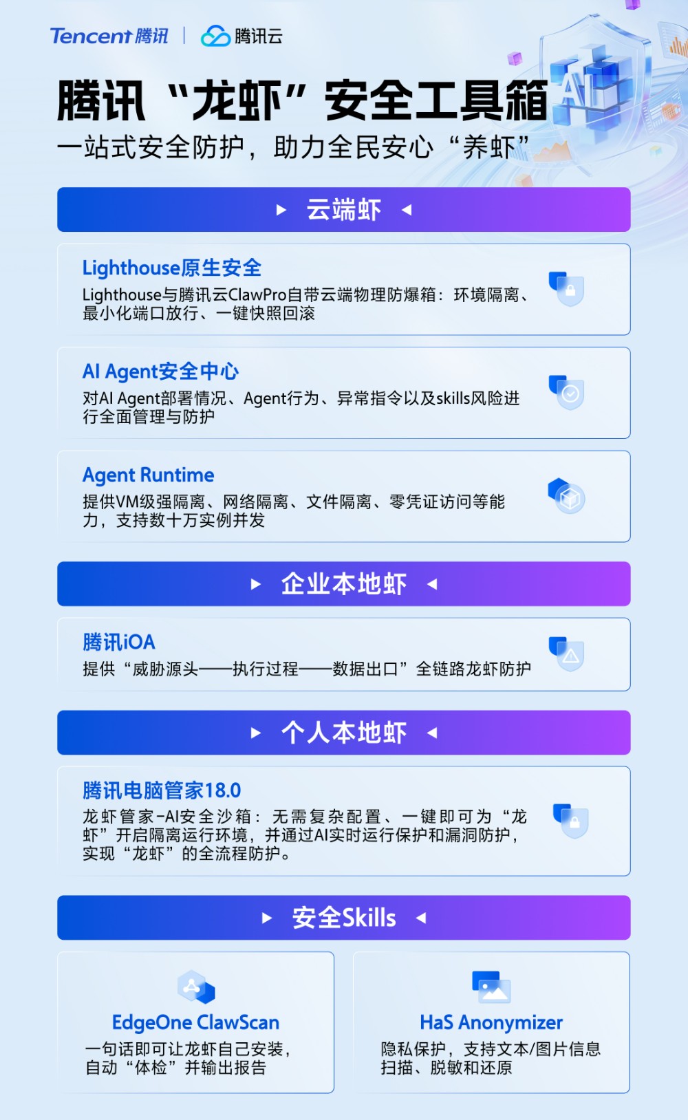 此外,腾讯还将一些安全能力封装成AI Skills,上架ClawHub、SkillHub社区,用户通过对话就能让“龙虾”实现自我防护。