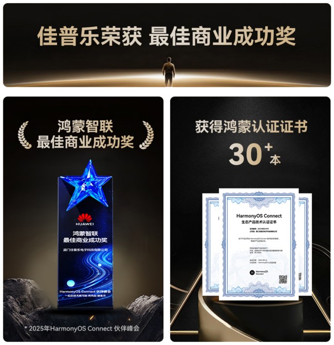 佳普乐与鸿蒙智联始于技术合作,深耕于场景创新。2025年3月,佳普乐曾在鸿蒙智联伙伴峰会中荣获“鸿蒙智联最佳商业成功奖”,成为行业生态化转型的标杆。时隔一年,佳普乐已从“单品智能”迈向“空间智能”,与鸿蒙生态共同打造出舒适、健康、无感交互的全场景智慧卫浴空间,完成从“生态参与者”到“生态共建者”的跃升。