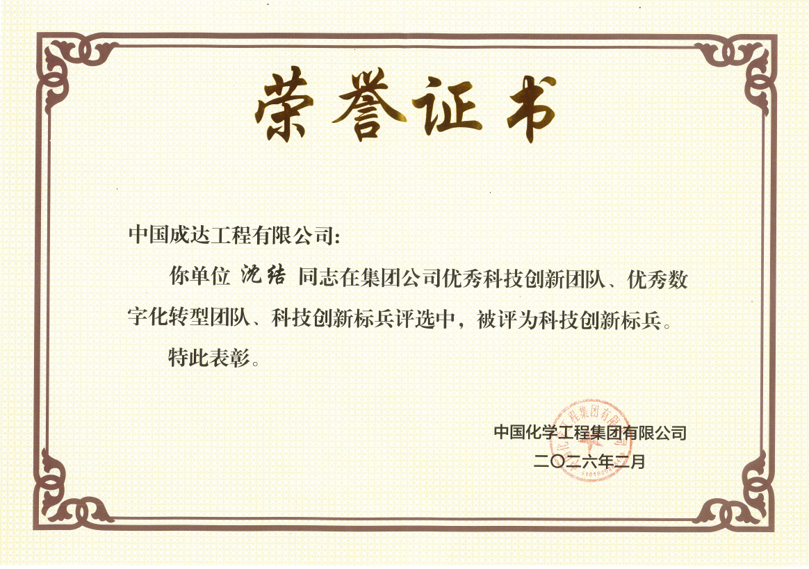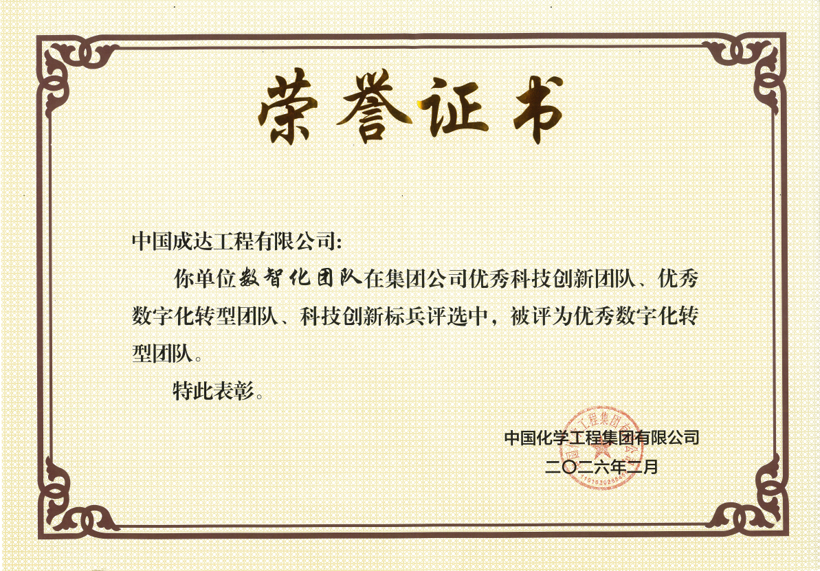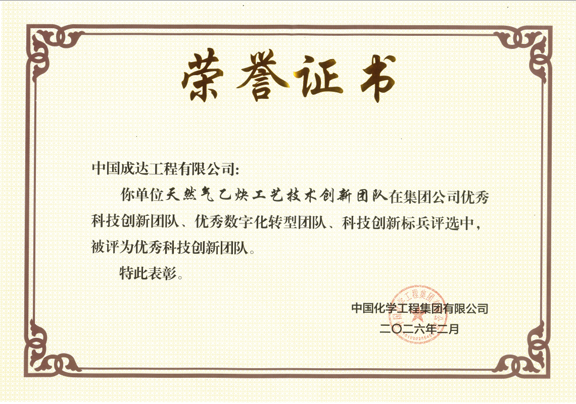近日,在中国化学工程集团公司“2026年高质量发展暨科技创新大会”上,中国化学工程成达公司凭借在数字化转型与科技创新领域的突出成果,斩获多项荣誉:“数智化团队”和“天然气乙炔工艺技术创新团队”分别荣获“优秀数字化转型团队”和“优秀科技创新团队”称号,设备室沈结获评“科技创新标兵”,充分彰显了公司在科技创新、数智赋能上的强劲实力。