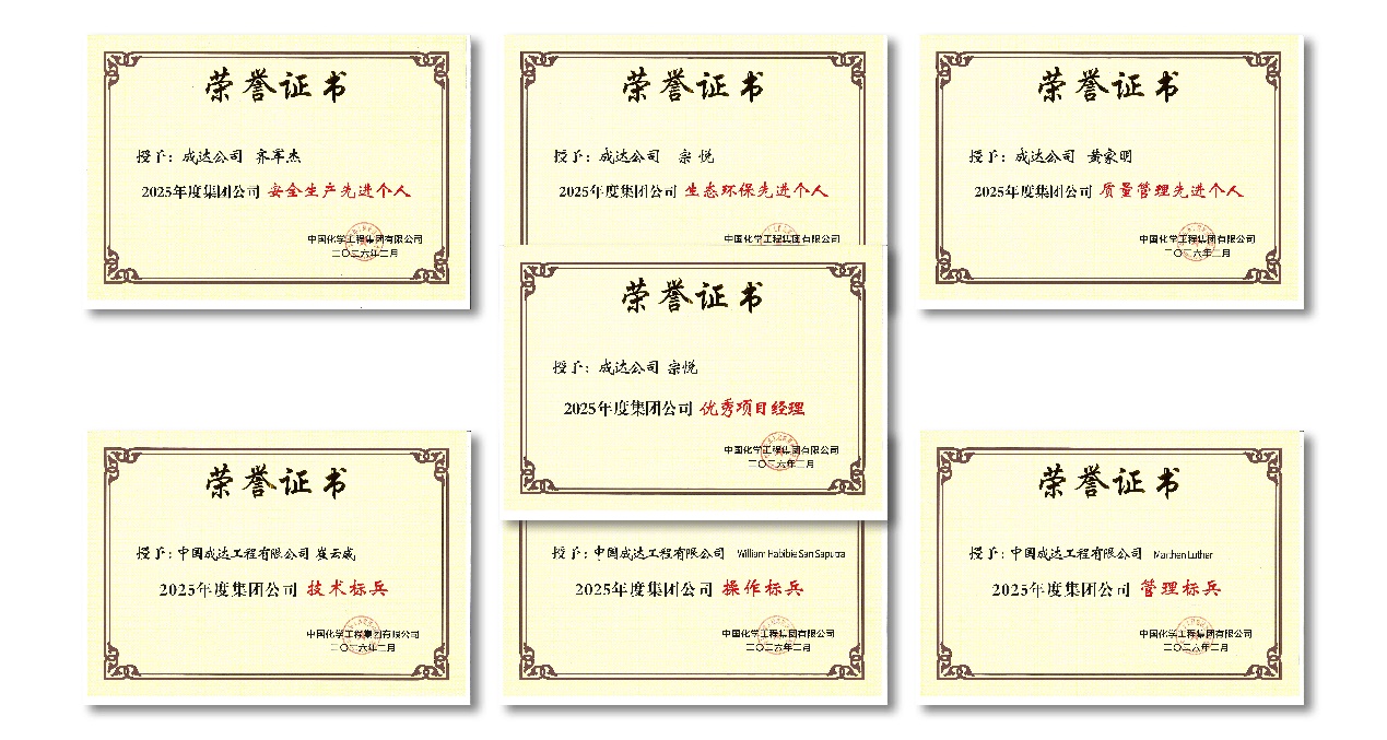 个人表彰方面,成达公司多名员工荣获集团公司7项个人荣誉。其中,项目管理部宗悦荣获“2025年度集团公司生态环保先进个人”“2025年度集团公司优秀项目经理”两项殊荣;施工管理部齐军杰、黄家明分别荣获“2025年度集团公司安全生产先进个人”和“2025年度集团公司质量管理先进个人”称号;成达印尼GPK公司崔云威荣获“2025年度集团公司技术标兵”称号;外籍员工WilliamHabibie San Saputra、MarthenLuther分别当选“2025年度集团公司操作标兵”、“2025年度集团公司管理标兵”。