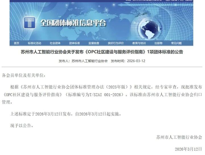 3月12日,由苏州市人工智能行业协会和苏州市长三角人工智能生态服务研究院共同牵头,联合近40家人工智能相关企事业单位、创业孵化载体机构、高校院所、OPC等共同制定的团体标准《OPC社区建设与服务评价指南》(T/SZAI 001—2026)正式发布并实施。该标准是国内首个针对以“单人+AI”(One Person Company,简称OPC)为核心特征的新型创业模式及其承载社区的系统性规范与评价指南,标志着OPC这一创新业态在规范化、专业化发展道路上迈出了关键一步。