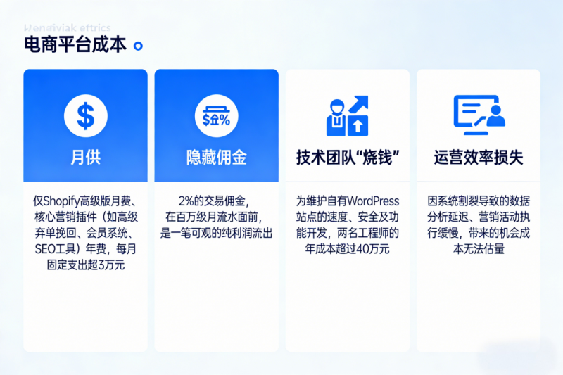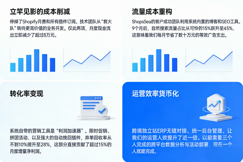 1、立竿见影的成本削减:“上线第一天,我们就停掉了Shopify月费和所有插件订阅。技术团队从‘救火队’转向更高价值的业务开发。仅此两项,月度现金流出立即减少了超过8万元。”