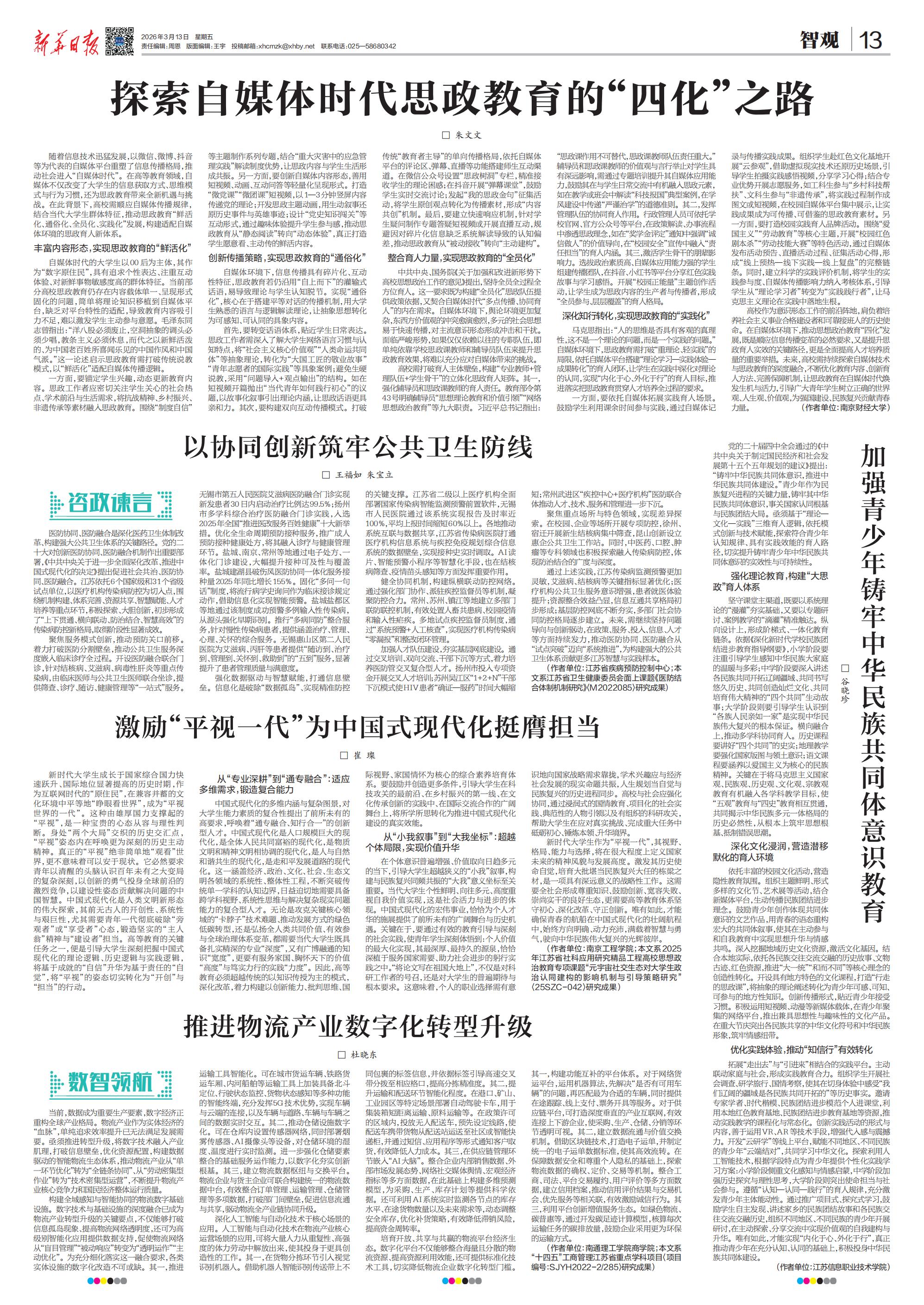 党的二十届四中全会通过的《中共中央关于制定国民经济和社会发展第十五个五年规划的建议》提出:“铸牢中华民族共同体意识,推进中华民族共同体建设。”青少年作为民族复兴进程的关键力量,铸牢其中华民族共同体意识,事关国家认同根基与民族团结大局。亟须基于“理论—文化—实践”三维育人逻辑,依托模式创新与技术赋能,探索符合青少年认知规律、具有实践效能的育人路径,切实提升铸牢青少年中华民族共同体意识的实效性与可持续性。