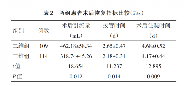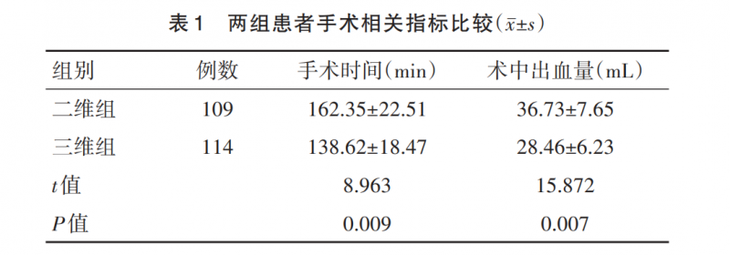 术后恢复加速:三维组术后引流管引流量(318.74±45.26)mL较二维组显著减少(表2),拔管时间(2.18±0.31)天、术后住院时间(4.17±0.44)天分别较二维组缩短17.7%和10.9%,大幅降低患者医疗负担与康复周期。