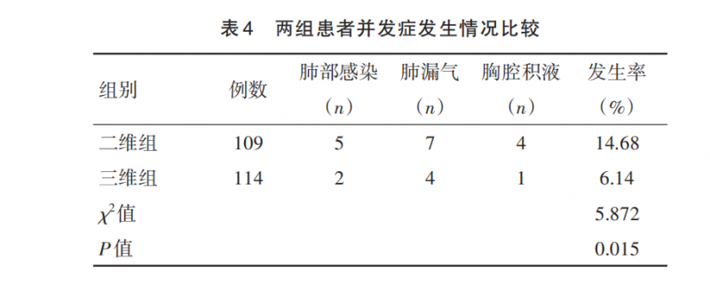 安全性显著提升:三维组并发症发生率较二维组降低58.2%(表4),肺部感染、肺漏气、胸腔积液等主要并发症风险大幅下降。