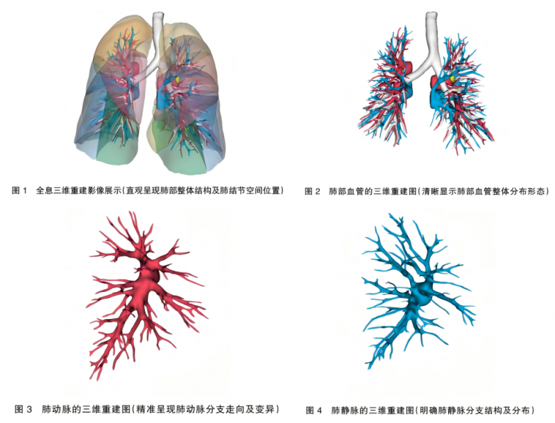 三维组:患者行胸部高分辨率CT扫描,将CT数据导入三维重建医学图像处理软件MedAI-3D。MedAI-3D利用先进的图像识别算法,对肺结节、各级支气管、肺动脉、肺静脉等结构进行自动识别、分割与重建,生成逼真的全息三维模型。全息三维重建影像整体展示,可直观呈现肺部整体结构及肺结节的空间位置(图1)。可清晰展示了肺部血管的整体三维重建形态(图2),分别聚焦肺动脉(图3)、肺静脉(图4)的三维重建细节,精准呈现血管的分支走向及变异情况。