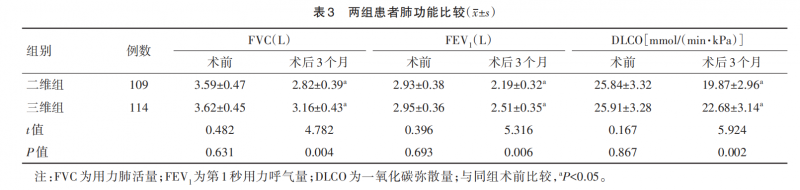 肺功能保护更佳:术后3个月,三维组用力肺活量(FVC)、第1秒用力呼气量(FEV1)、一氧化碳弥散量(DLCO)下降幅度均小于二维组,且各指标水平显著更高(表3),体现了精准手术对肺组织的微创保护效应。