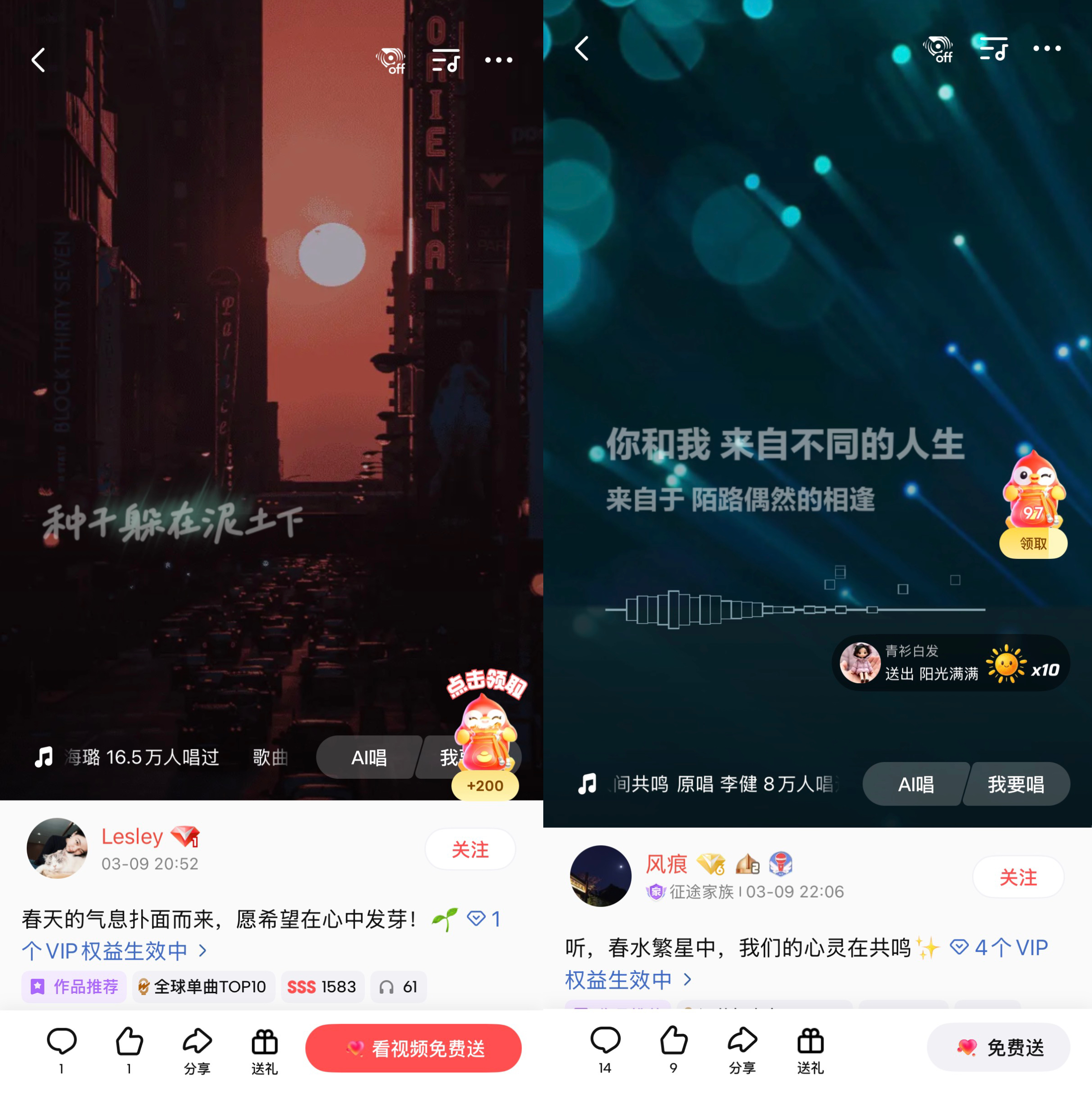 2026年中央广播电视总台春节联欢晚会歌曲篇章,汇聚流行、抒情、国风、民族、跨界合唱等多元曲风,既有唱响家国情怀的时代旋律,也有抚慰人心的温情金曲,更有活力四射的青春力作。从勾勒春日生机的《立春》、空灵治愈的《吉量》,到深情走心的《人间共鸣》《别来无恙》、动感十足的《闪耀动起来》,再到传递团圆与思念的《你我经历的一刻》,每一首都兼具感染力与传唱度,用旋律定格除夕夜的温暖与感动。春节至今,依旧有许多乐迷乐迷来到全民K歌,用歌声延续着这份独属于新年的温暖与回忆。例如,K歌网友“Lesley”运用“VIP伴奏”翻唱了《立春》,展现了歌曲里清新治愈、万物复苏的春日氛围感;K歌网友“风痕”在“VIP伴奏”“VIP音质”“录唱皮肤”以及“作品加热”四种功能加持下翻唱了《人间共鸣》,将歌曲里温柔治愈、直抵人心的力量完美呈现,唱出独属于自己的深情与共鸣。