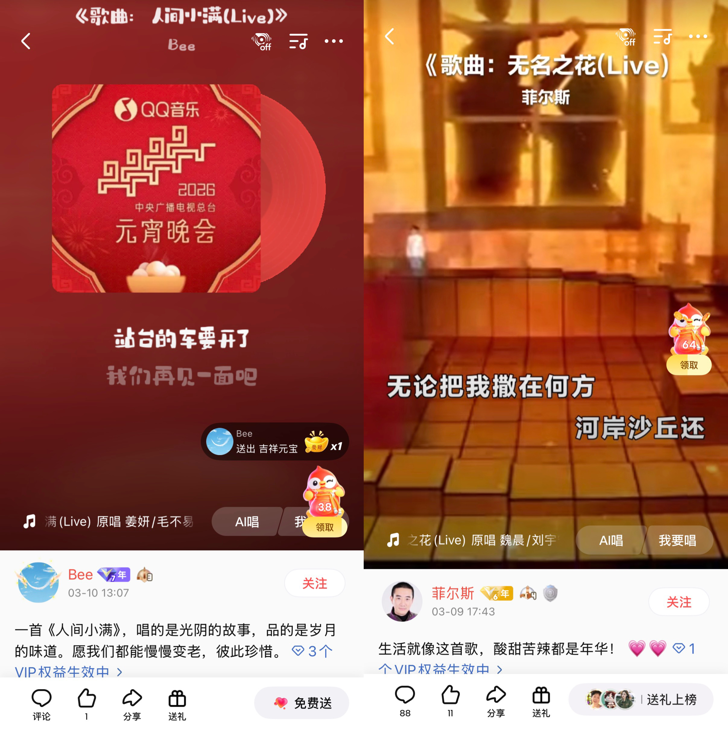 继春晚金曲持续热播之后,全民K歌也同步上线了2026年元宵晚会多首热门歌曲伴奏,让温馨团圆的旋律继续唱响,也引发了一股翻唱热潮。K歌网友“Bee”翻唱了《人间小满》,在“VIP音效”、“录唱皮肤”“VIP伴奏”的辅助下将歌曲里温润治愈、知足常乐的意境温柔诠释;K歌网友“菲尔斯”运用“VIP音效”翻唱了《无名之花》,将歌曲里温柔又坚韧的力量细腻呈现,每一句都藏着治愈人心的力量。