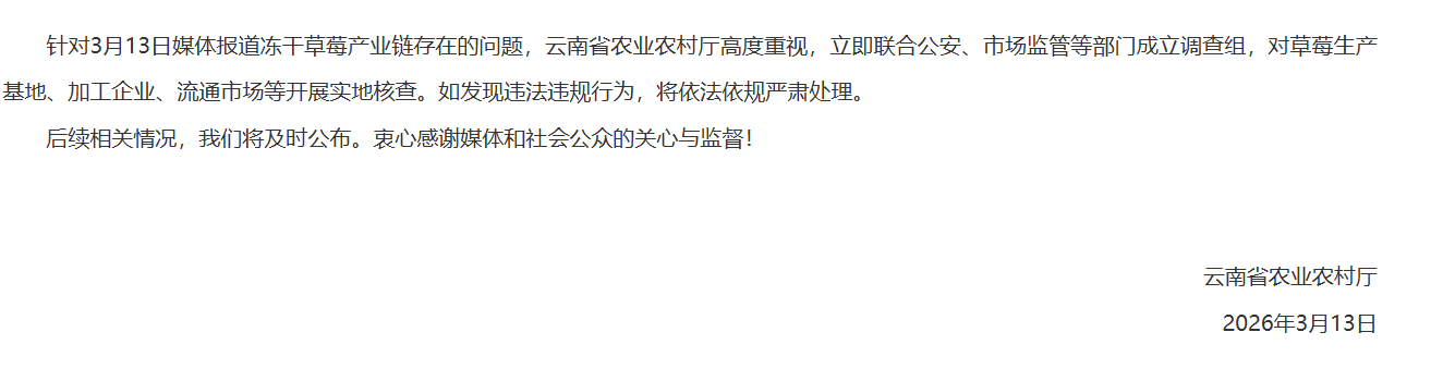 针对3月13日媒体报道冻干草莓产业链存在的问题,云南省农业农村厅高度重视,立即联合公安、市场监管等部门成立调查组,对草莓生产基地、加工企业、流通市场等开展实地核查。如发现违法违规行为,将依法依规严肃处理。 后续相关情况,我们将及时公布。衷心感谢媒体和社会公众的关心与监督!