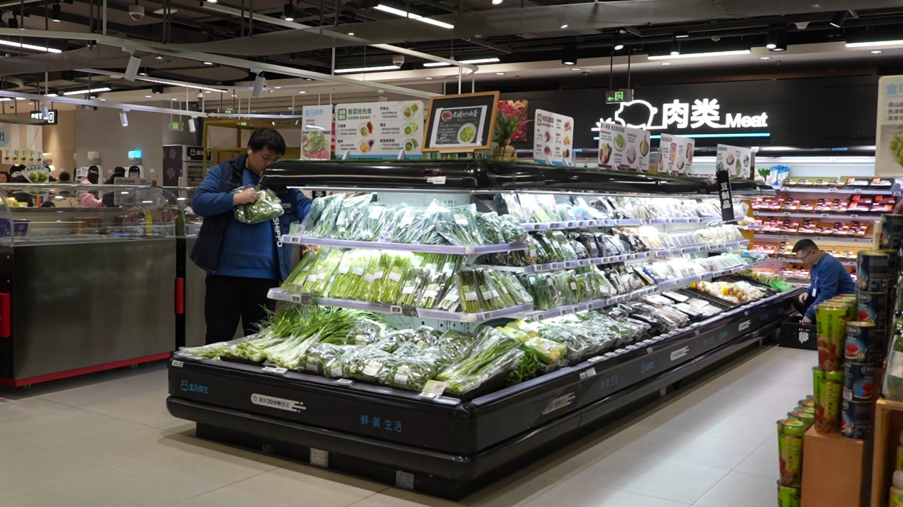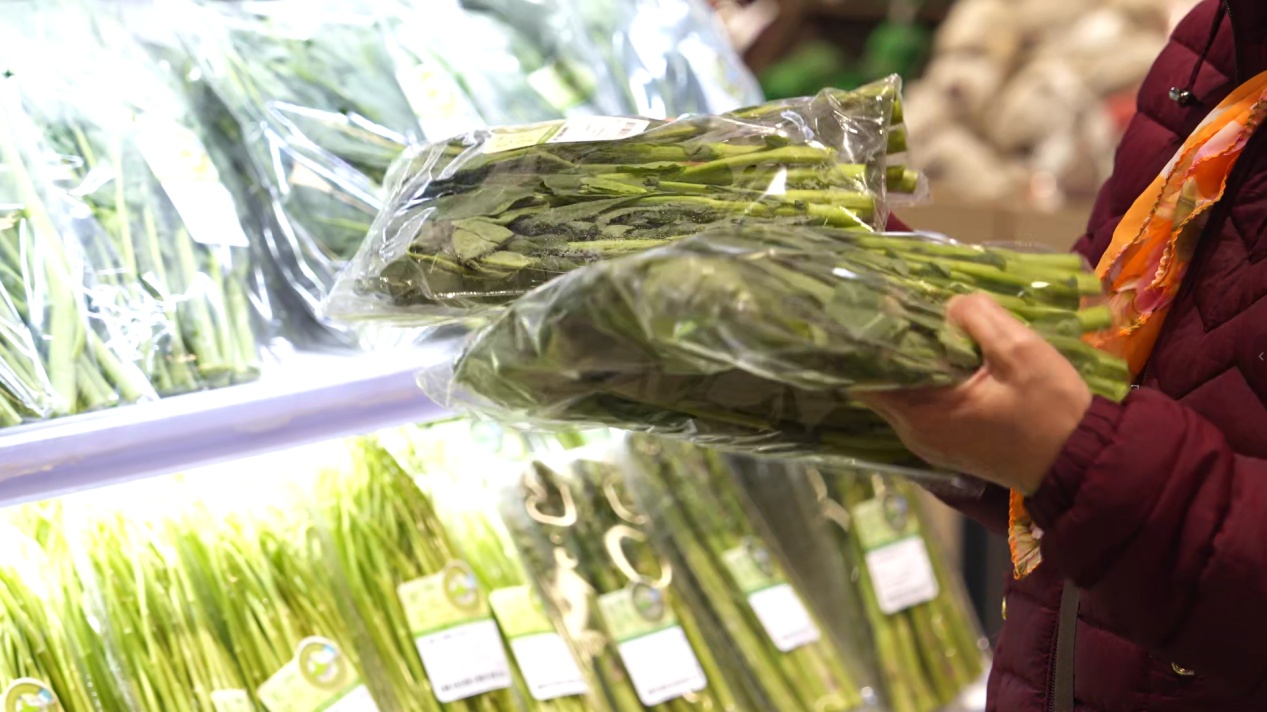 姚明东:板蓝根青菜、芦笋、芦蒿、香椿,这几款蔬菜是卖得比较好的。今年春菜和去年同期相比的话,我这家店的(销售量)大概增长20%左右。