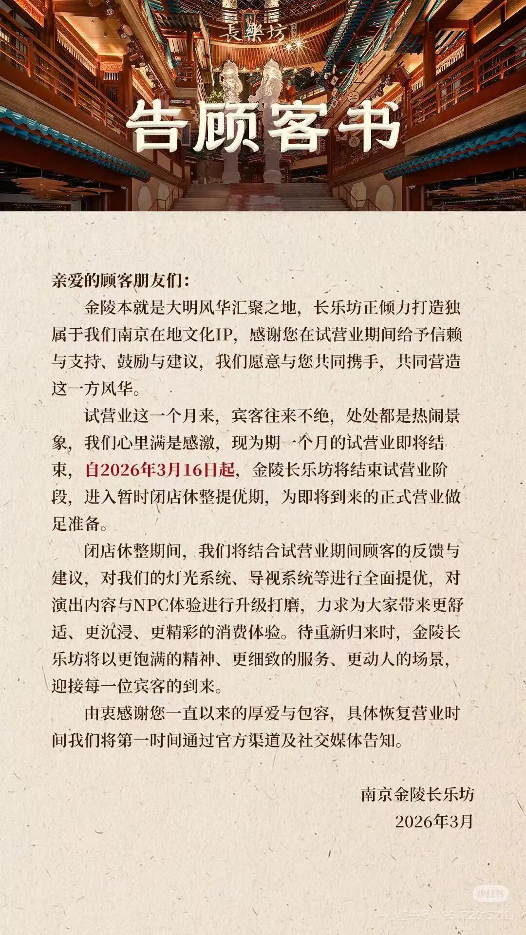 自2026年3月16日起,金陵长乐坊将正式结束试营业阶段,进入闭店休整提优期。其间我们将结合顾客反馈,对灯光系统、导视系统、演出内容及NPC体验等进行全面优化升级,为正式营业做好充分准备。